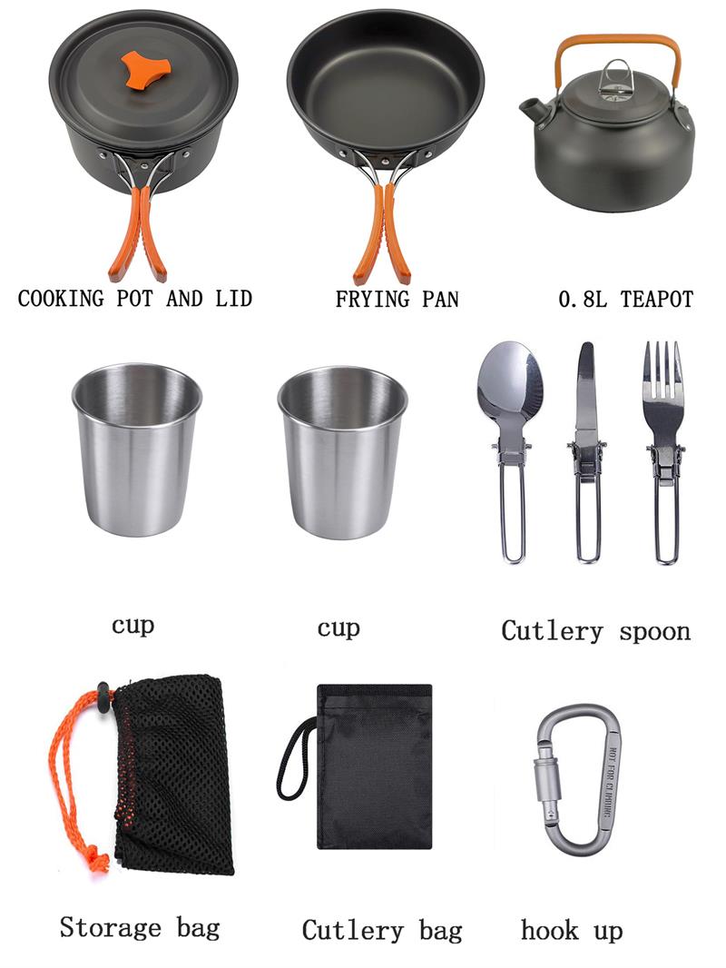 Suitable for 2-3 people, including a large pot, frying pan, a teapot, two stainless steel cups, a fork, a spoon, a table knife, a lock, and a cutting board. The pot set is made of aluminum alloy, which has undergone advanced hard treatment and is resistant to high temperatures and friction. The stove head and cutlery and spoons are made of stainless steel, which is resistant to high temperatures and has high strength.